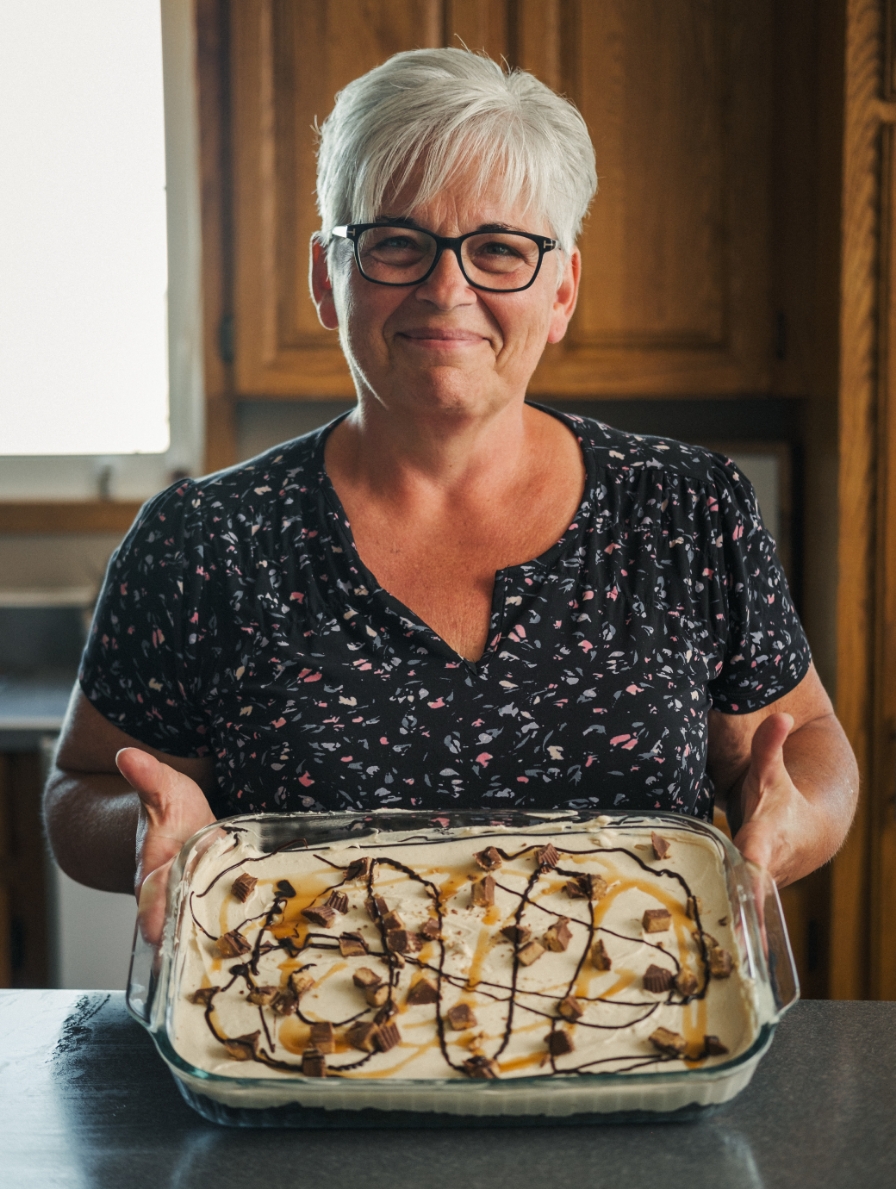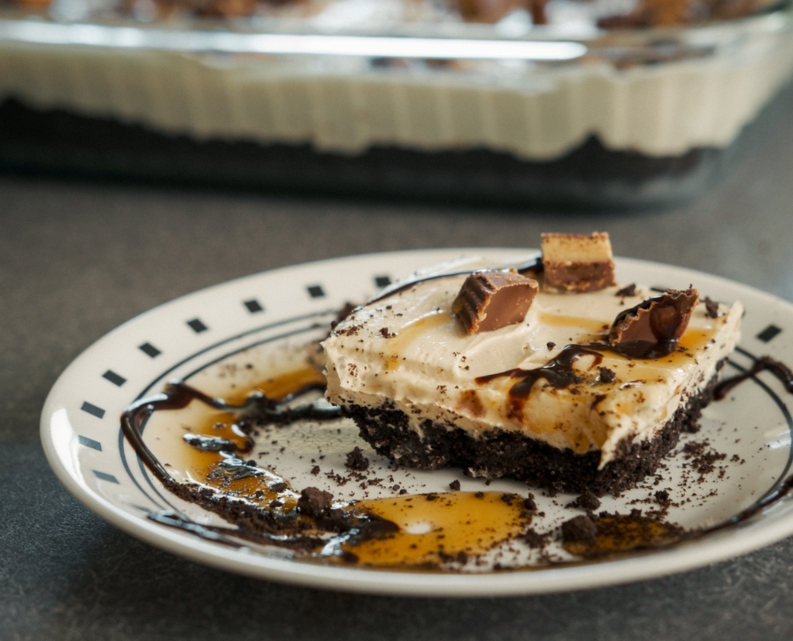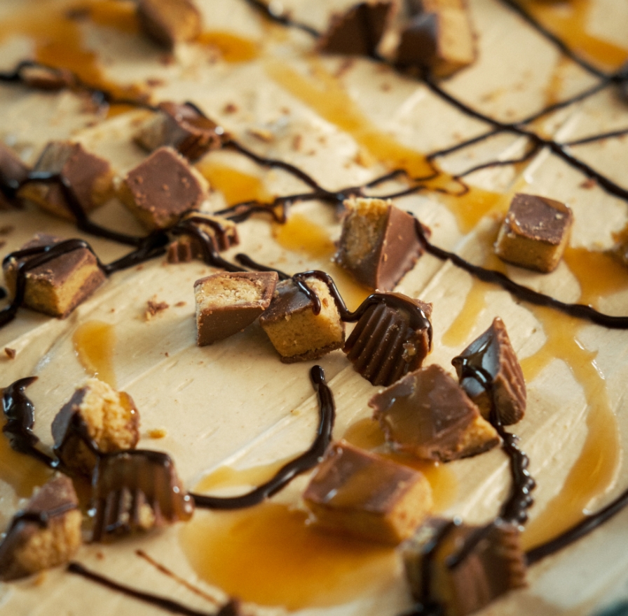 4. Once assembled, roughly chop the Reese’s Peanut Butter Cups into bite-sized chunks and sprinkle on top with a drizzle of chocolate and caramel sauce to taste.
